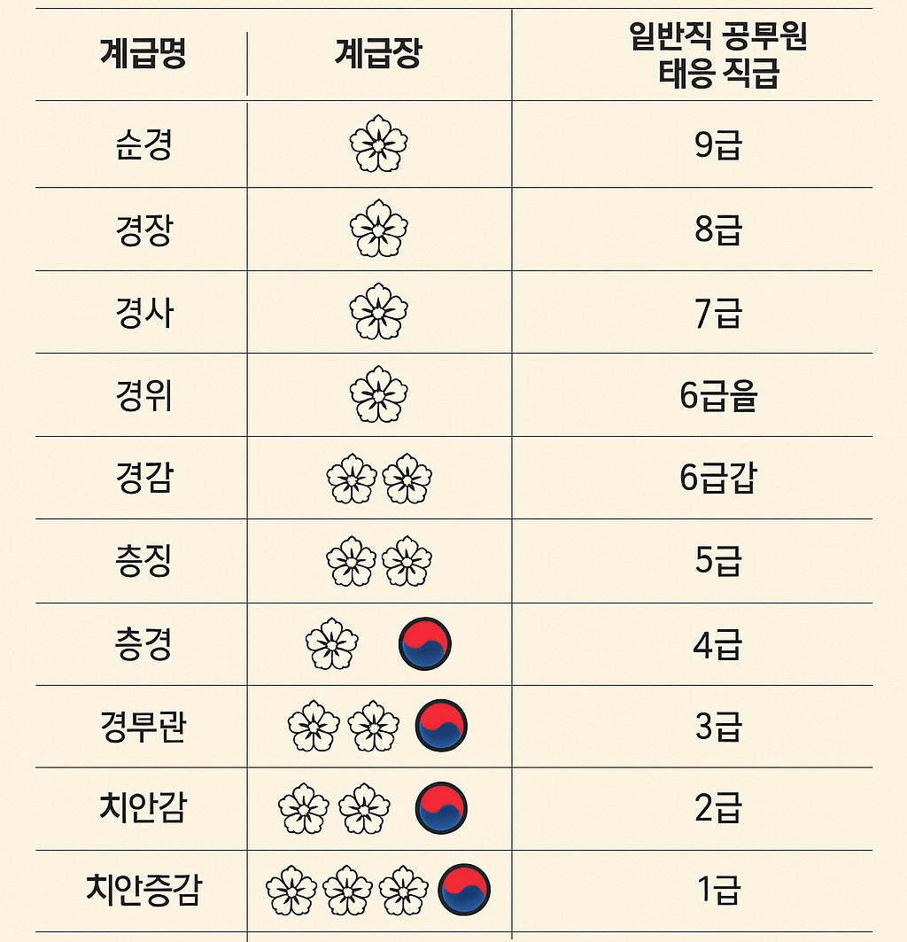 | 순경 | 무궁화 1개 | 9급 | 초임 경찰, 기초 치안 |