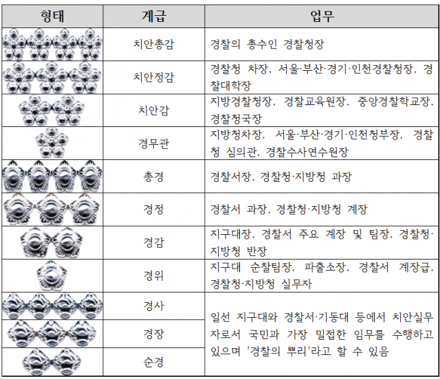 | 계급명 | 계급장 상징 | 일반직 공무원 대응 | 주 업무 |