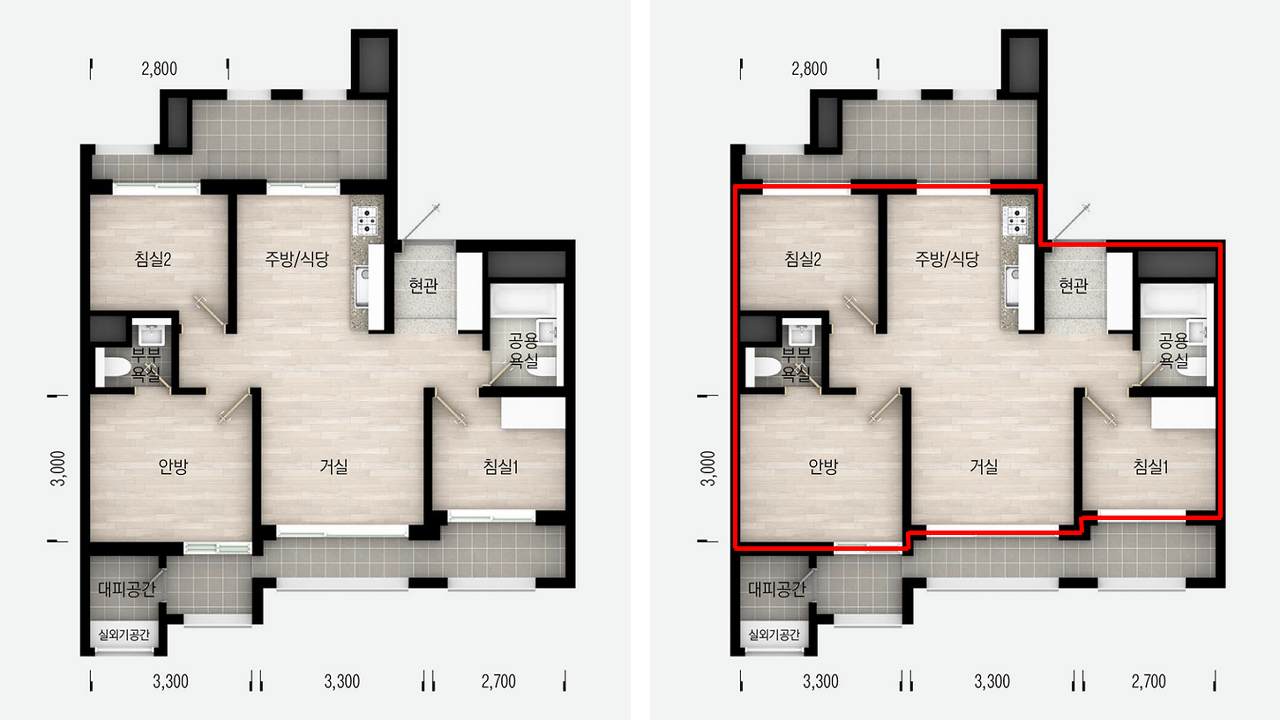 • 체감 면적 영향: 발코니 확장, 수납 설계, 벽체 두께
