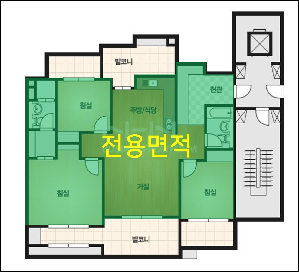 • 주거공용면적: 복도, 계단, 엘리베이터, 공용 출입구, 관리사무소 일부 등 공동 사용 공간