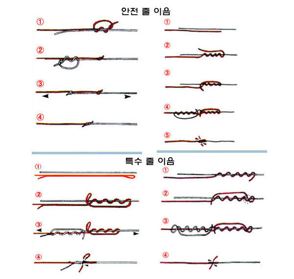 - 합사(PE)는 미끄러짐이 심하므로 매듭 강도가 뛰어난 매듭법이 필요합니다.
