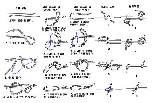 각 매듭마다 “결속 부위가 얼마나 잘 잡혀 있는지”, “묶는 과정이 복잡한지”, “경우에 따라 추가로 변형해서 쓸 수 있는지” 등 다양한 특징이 있기에 상황별로 최적의 매듭을 선택해 주면 좋습니다.