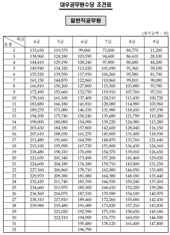 대우공무원수당 조견표