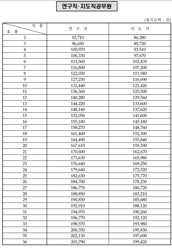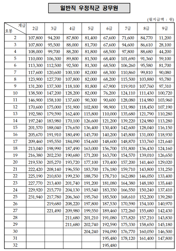 - 직종별 봉급표(일반직, 공안, 우정, 연구·지도) 중 본인 직군 확인