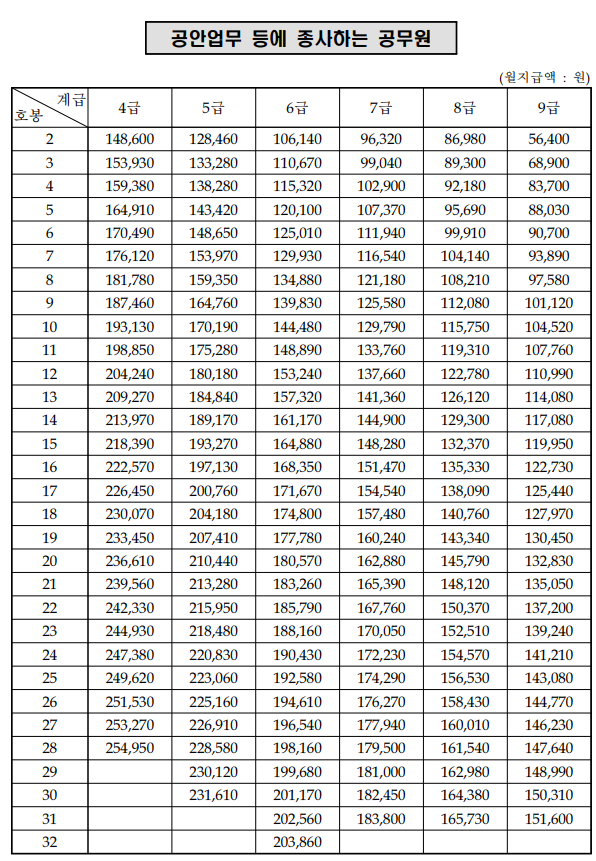 - 공안직은 같은 호봉에서도 일반직보다 기본급이 높아 대우수당도 커집니다.