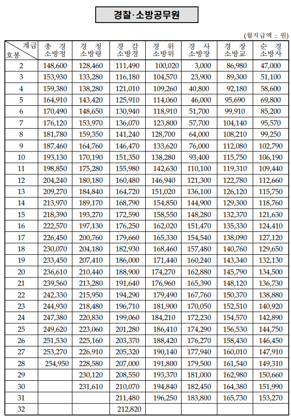 • 공안직은 같은 호봉에서도 일반직보다 기본급이 높아 대우수당도 커집니다.