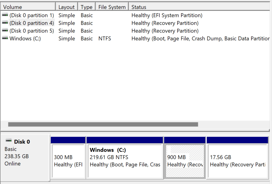 - 디스크 관리 또는 설치 프로그램에서 기존 파티션 확인