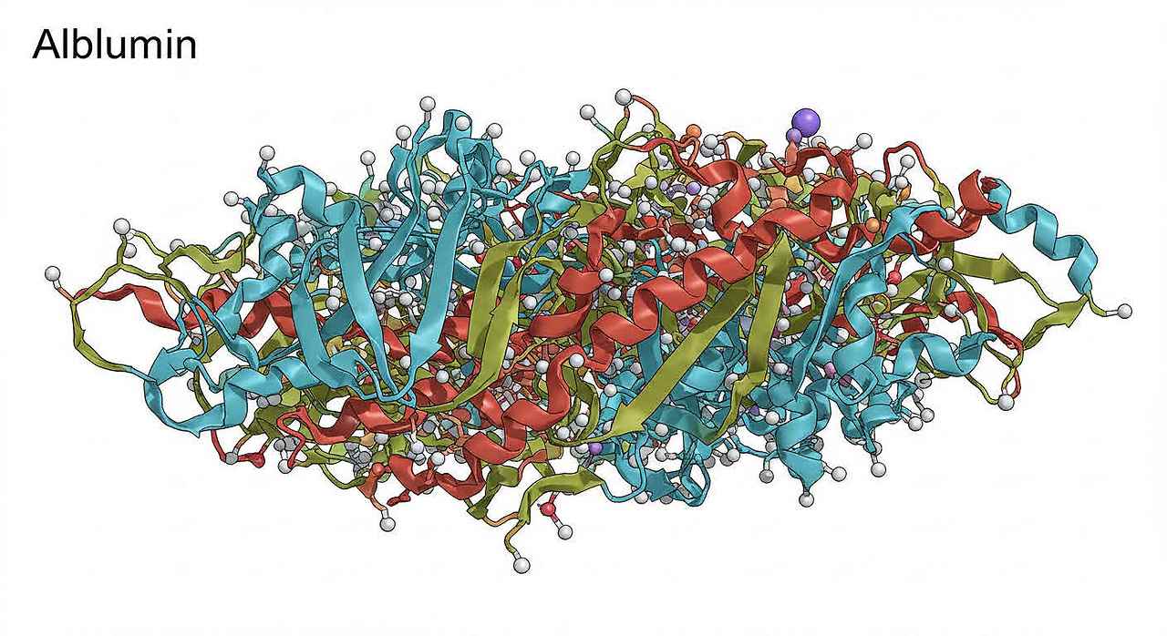알부민(albumin)은 인체에서 가장 많이 존재하는 단백질 중 하나로, 주로 혈장에서 발견됩니다. 간에서 합성되며, 전체 혈장 단백질의 약 60%를 차지할 정도로 중요한 단백질입니다.