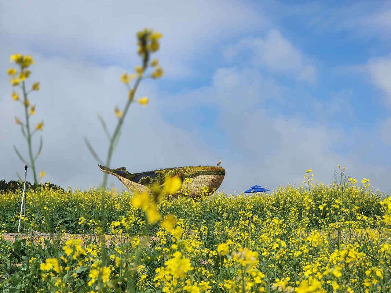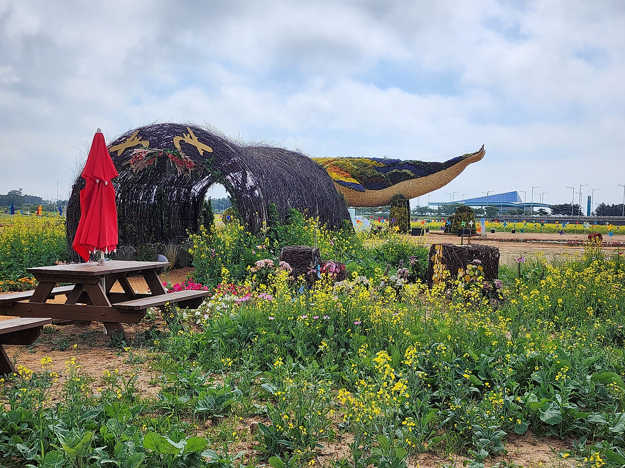인천공항 하늘정원 이벤트가든에서는 유채꽃밭을 포함하여 다양한 즐길거리가 마련되어 있습니다. 특히, 고양국제꽃박람회와 협업하여 만든 초대형 꽃등고래 조형물(길이 20m, 높이 10m)이 눈길을 끕니다.