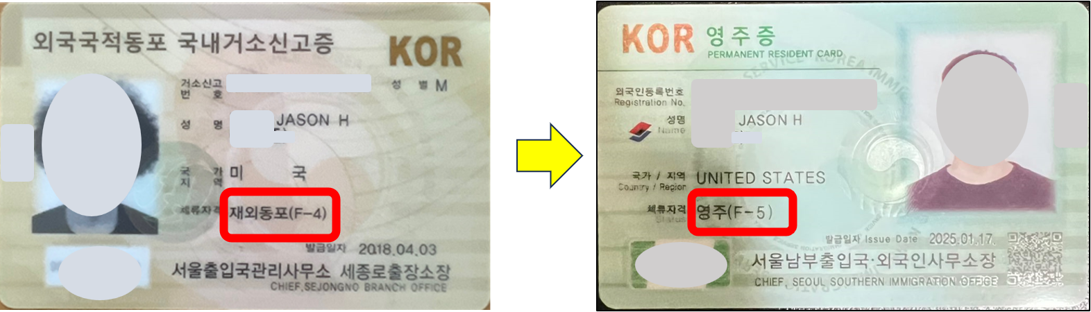 한국의 경우 외국인을 대상으로 F-5 영주비자가 ‘영주권’에 해당하며, 대한민국 국적 취득은 ‘시민권(귀화)’으로 구분됩니다.