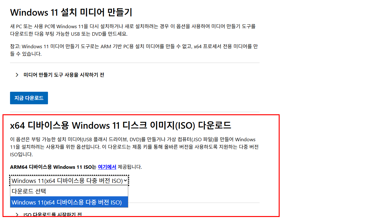 - 페이지를 아래로 내려 ‘Windows 11 디스크 이미지(ISO) 다운로드’ 항목을 찾습니다.