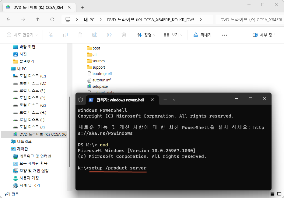 setup.exe를 바로 실행하지 말고 명령 프롬프트를 관리자 권한으로 엽니다. - 명령 프롬프트에서 아래 명령어를 입력합니다.