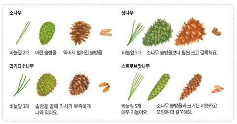 - 잣나무: 잎이 5개씩 붙어 있고, 솔방울이 크며 잣을 수확할 수 있습니다. 잣은 고급 식재료로 쓰이며, 잣나무는 관상수로도 인기가 높습니다.