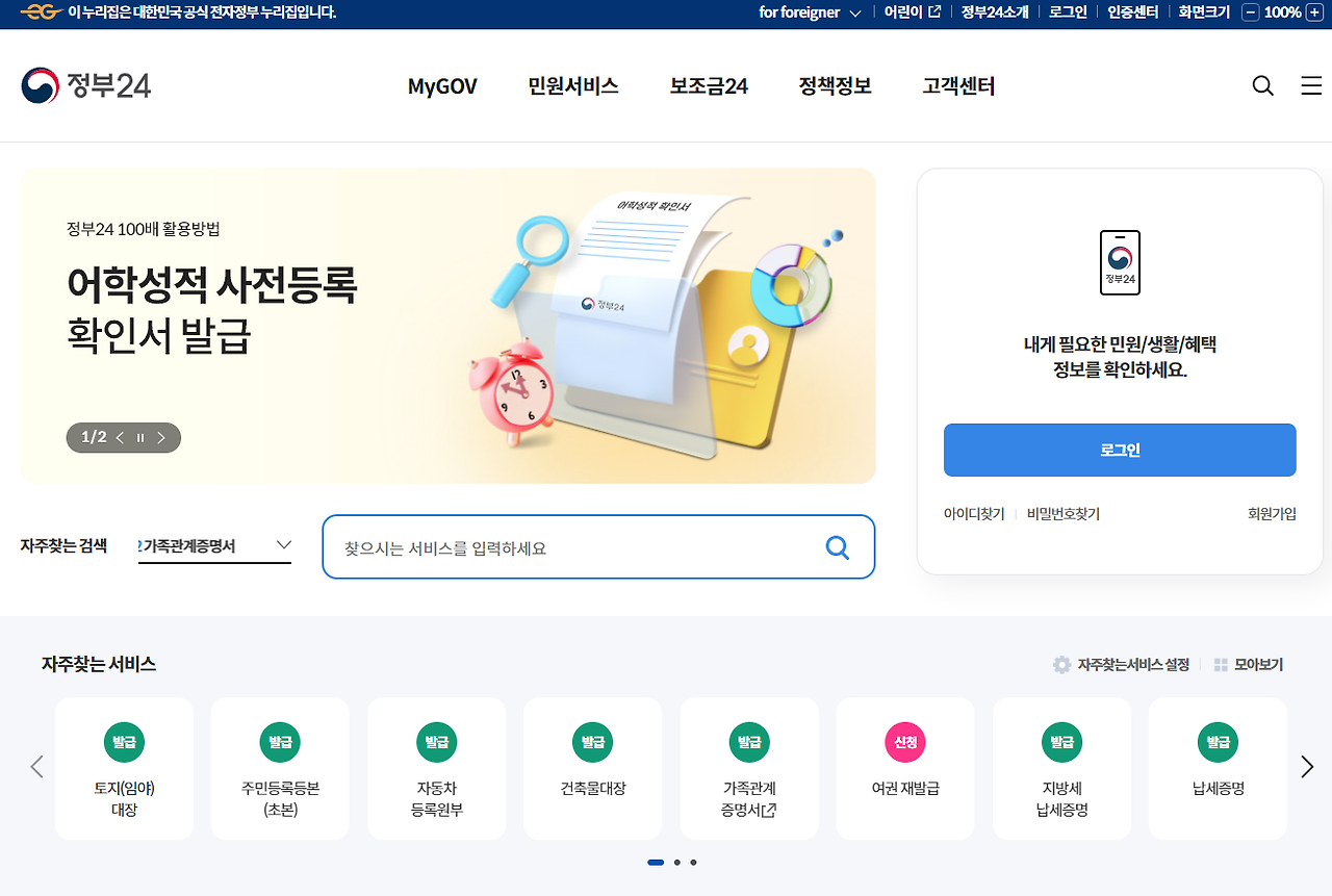 - 정부24 웹사이트 접속: 먼저 정부 24 웹사이트(https://www.gov.kr)에 접속합니다.