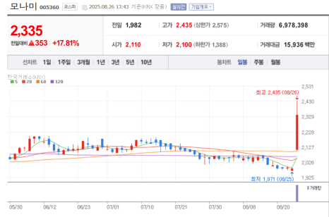 실제 모나미 주가 흐름 (2025년 8월 26일 기준):