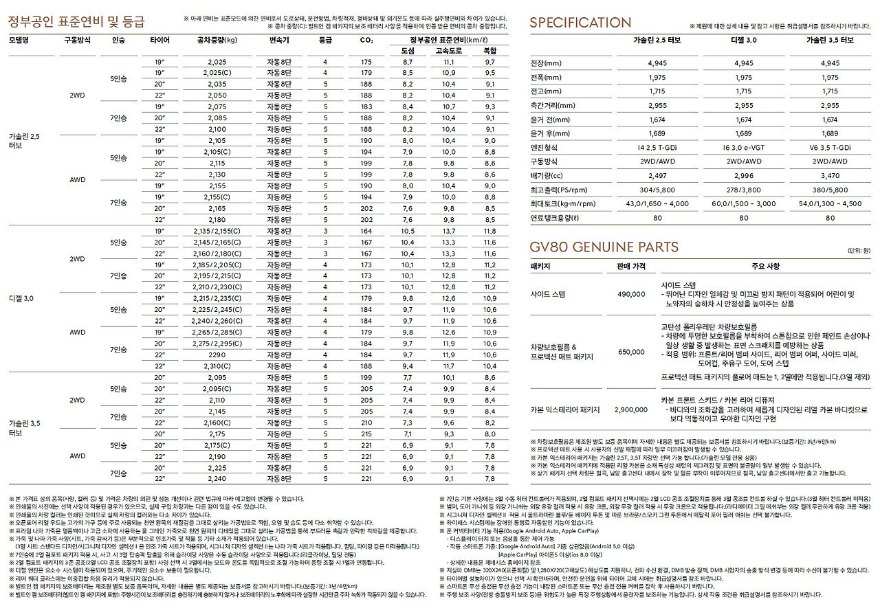 GV80 파워트레인 및 GV80 제원 구성