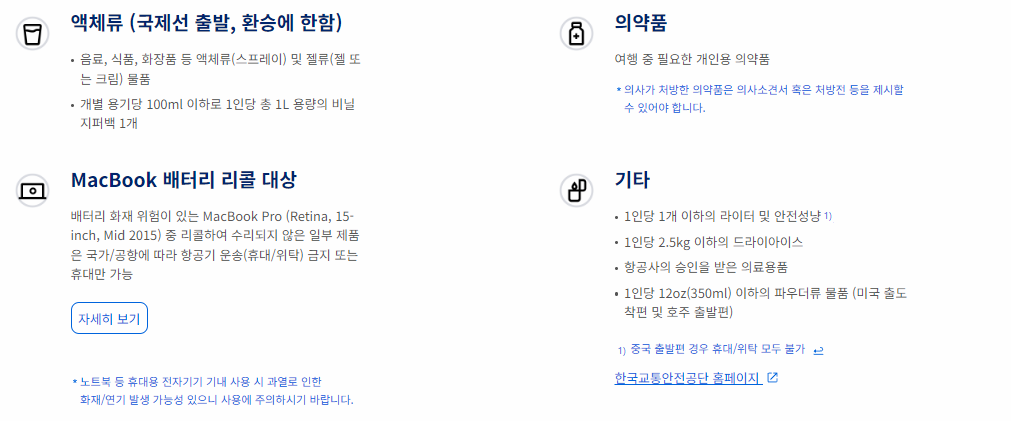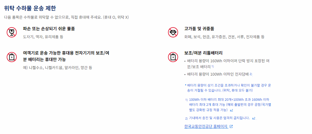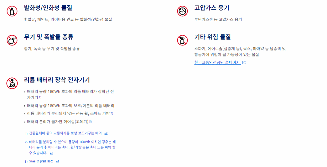 - 전동 휠체어: IATA 배터리 운송 규정 준수 필요, 사전 승인 필수