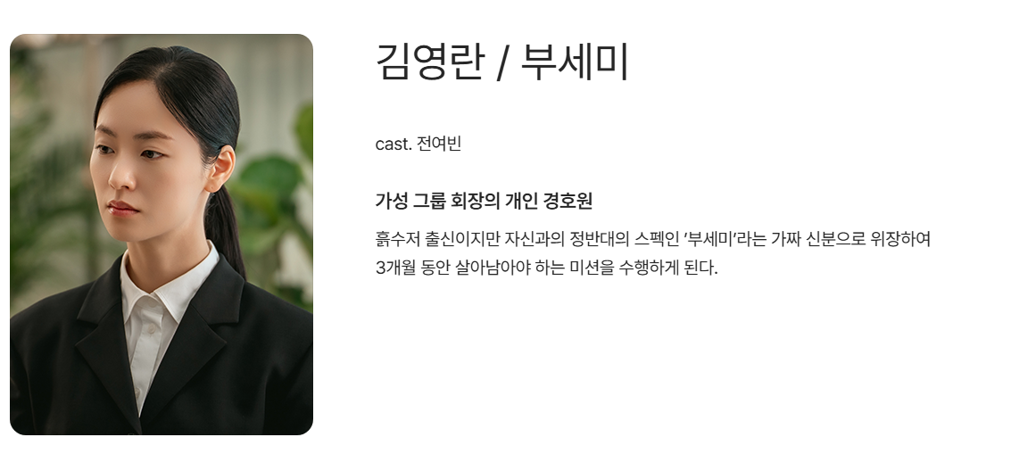 김영란 / 부세미 전여빈 흙수저 출신 경호원 → ‘부세미’라는 가명 하에 3개월 임무 수행