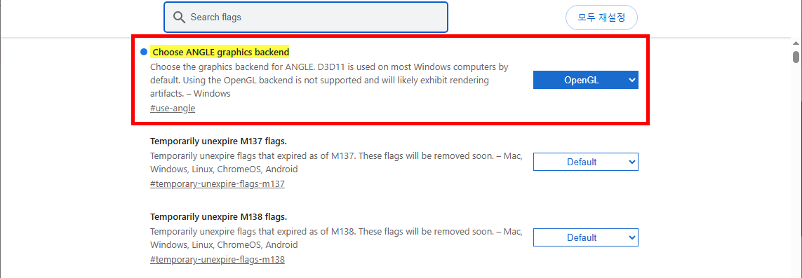 Ctrl + F→ANGLE검색 → Choose ANGLE graphics backend 찾기- 드롭다운에서 OpenGL 선택 → 우측 하단 [Relaunch] 클릭