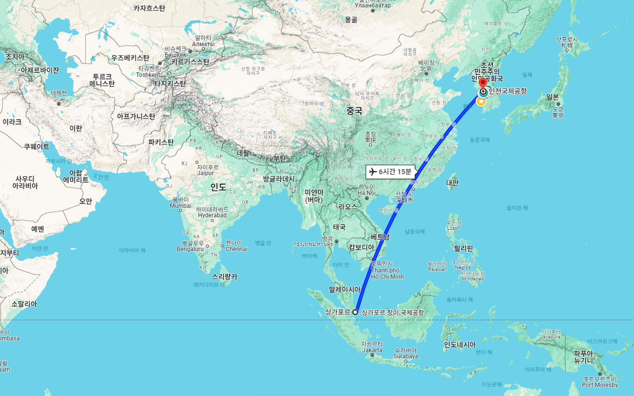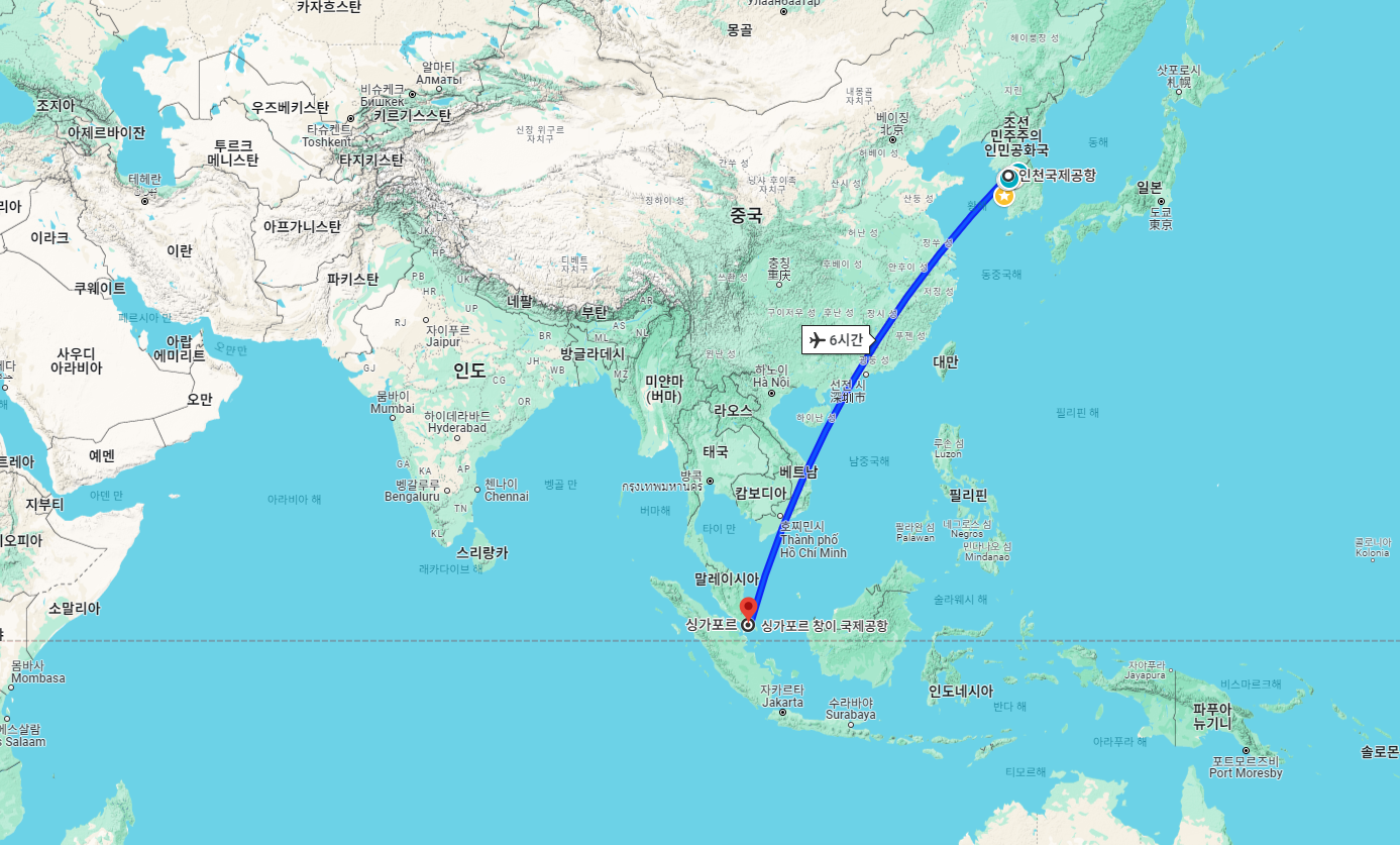 인천국제공항에서 싱가포르의 창이 공항까지의 한국에서 싱가포르 비행시간은 약 6시간 50분 정도입니다. 이 시간은 직항 항공편을 기준으로 하며, 항공사에 따라 약간의 차이가 있을 수 있습니다. 또한, 기상 조건이나 항로에 따른 영향을 받을 수도 있습니다. 서울에서 출발하는 항공편은 대체로 6시간에서 7시간 사이의 비행시간이 소요되며, 부산이나 인천에서도 비슷한 시간이 걸립니다. 대체로 한국에서 싱가포르까지의 비행은 비교적 짧은 시간 내에 도착할 수 있어, 여행자들이 부담 없이 이동할 수 있습니다.
