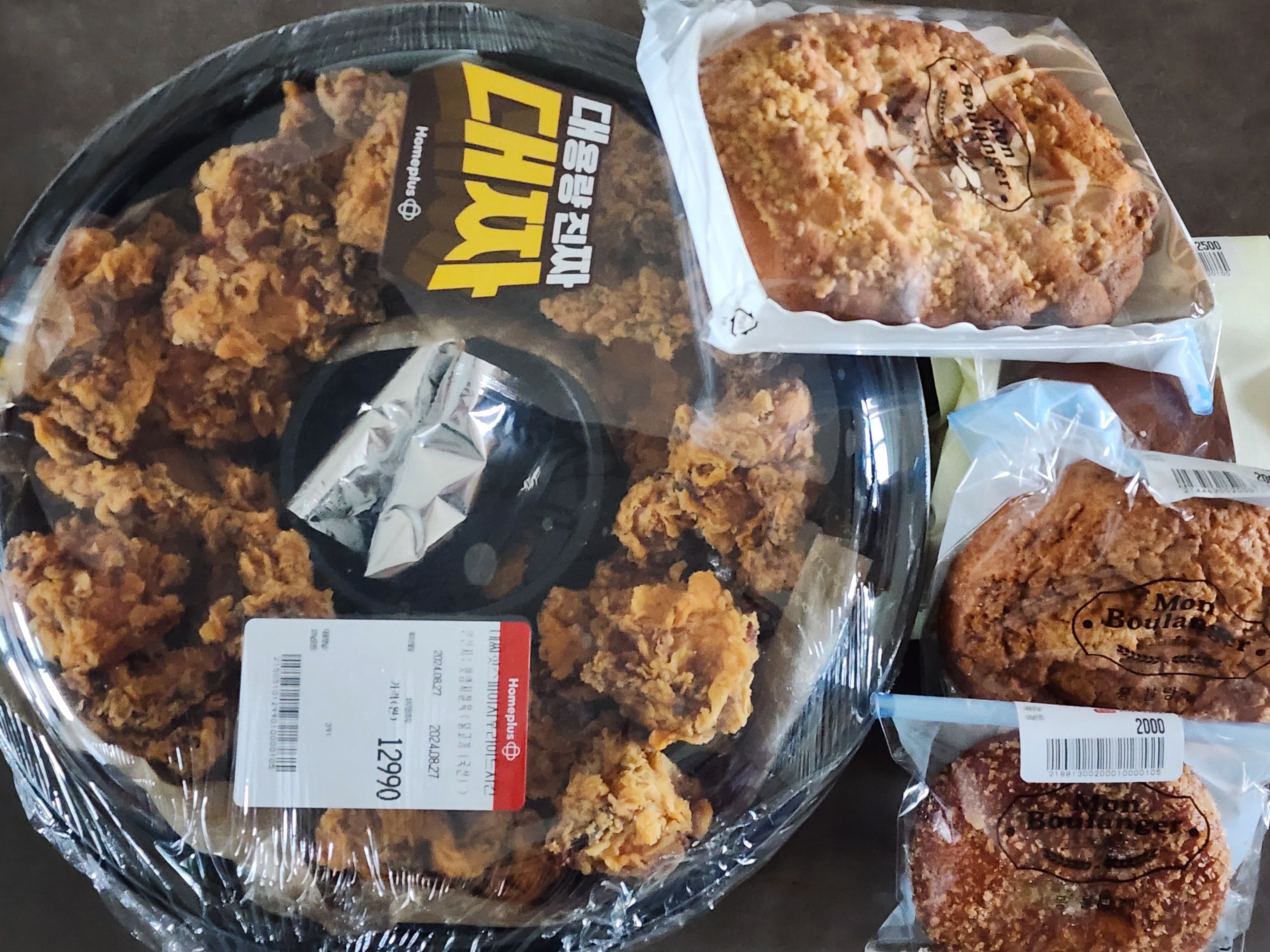 홈플러스는 이 치킨을 당일에 만들어 판매하며, 덕분에 배송 후에도 따뜻함이 유지되었습니다. 배달받은 첫날 가족 3명이서 먹고 대부분 남았습니다. 치킨을 냉장 보관했다가 에어프라이어에 3분 정도 데우니, 치킨의 바삭한 식감이 되살아나 더욱 맛있게 느껴졌습니다. 우리 가족이 치킨에 환장하는 스타일이 아니라서, 저 혼자서 3일을 먹었습니다. ㅜㅜ