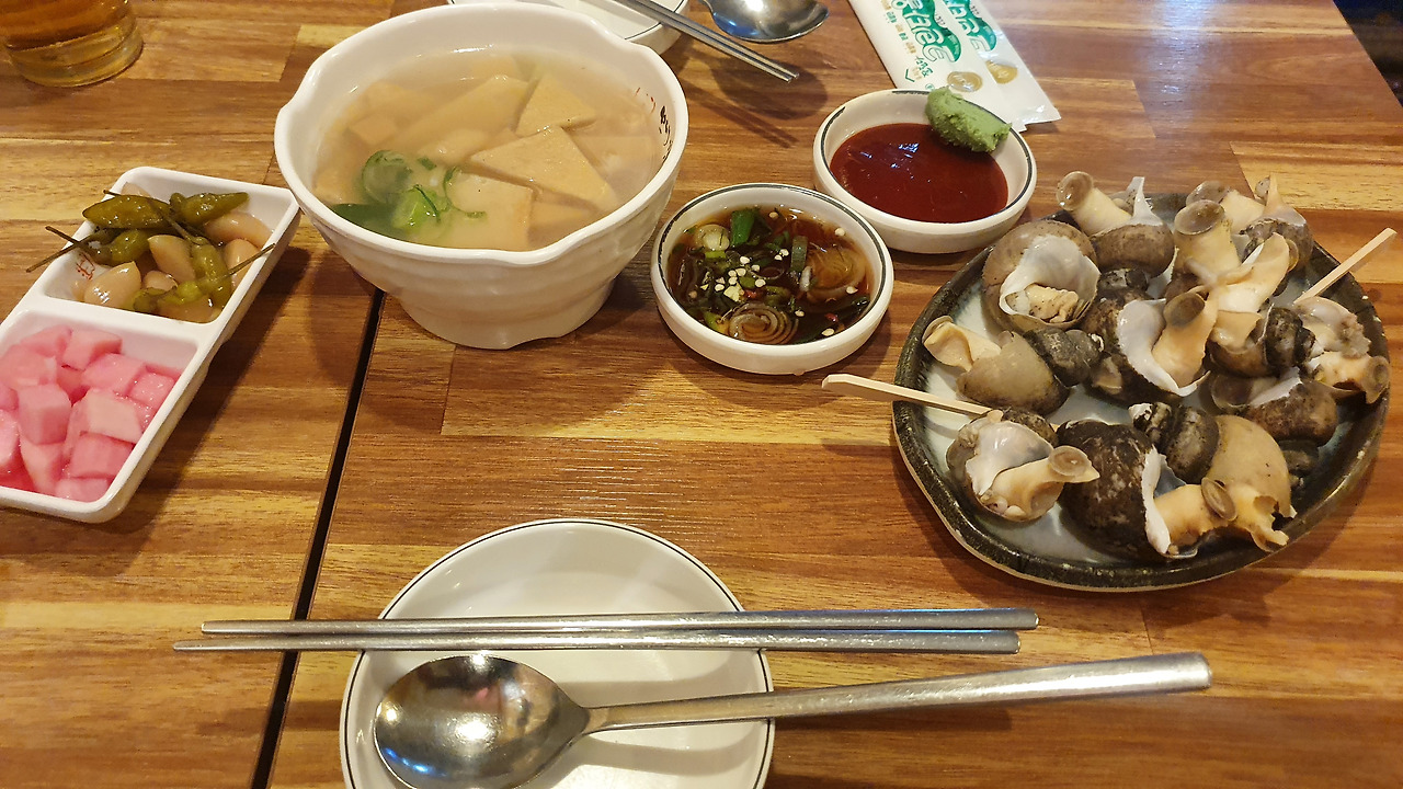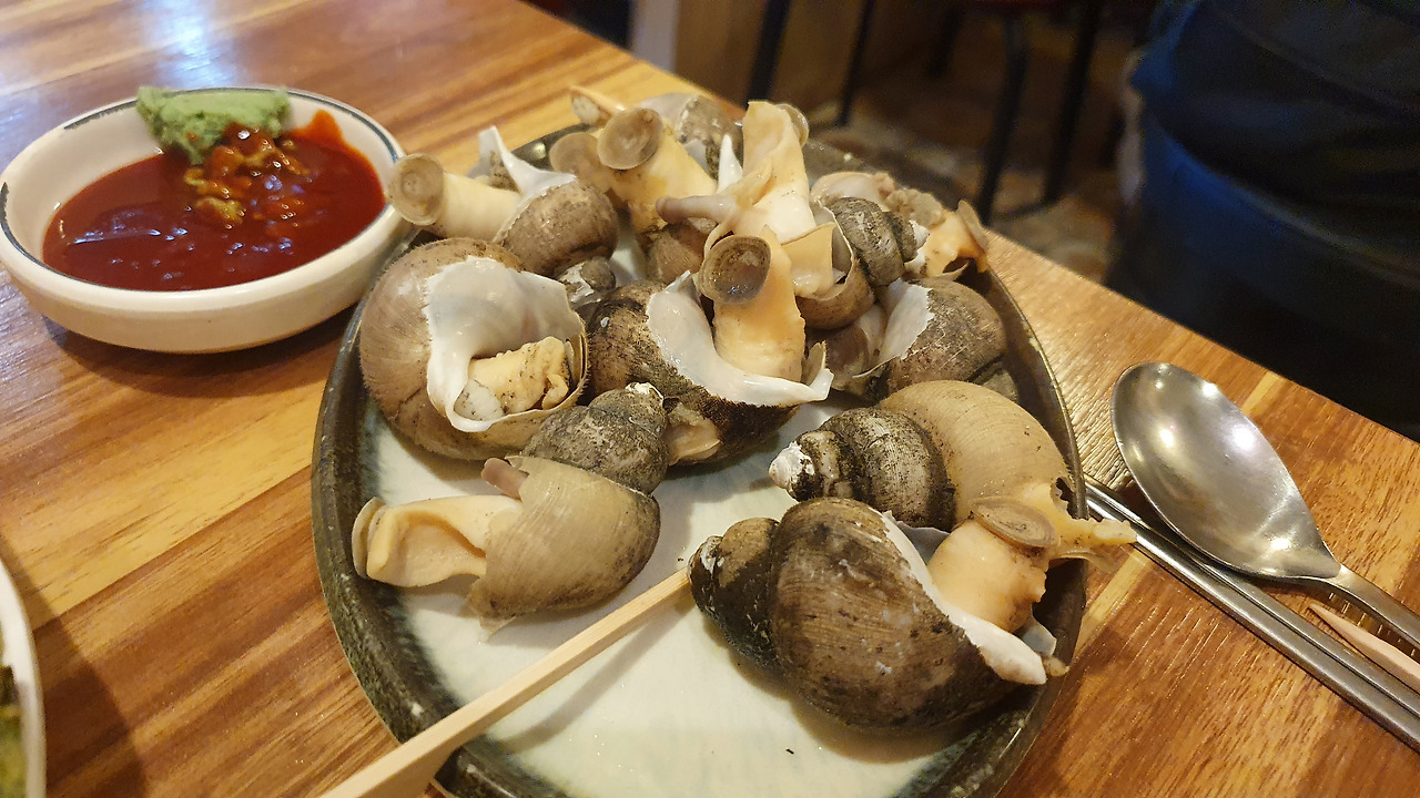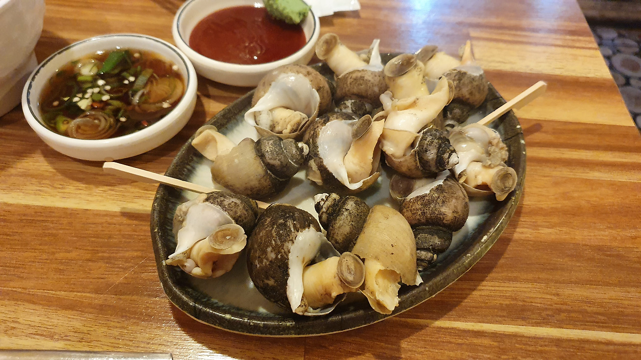 특히 초장에 와사비를 섞어 먹었을 때 특유의 알싸한 맛이 입안을 꽉 채워주어 술이 절로 들어갑니다. 전과는 또 다른 맛의 결로, 짭조름하고 바다향이 살아있는 이 골뱅이는 마치 해질 무렵 포장마차에서 마시는 한 잔을 연상케 했습니다.