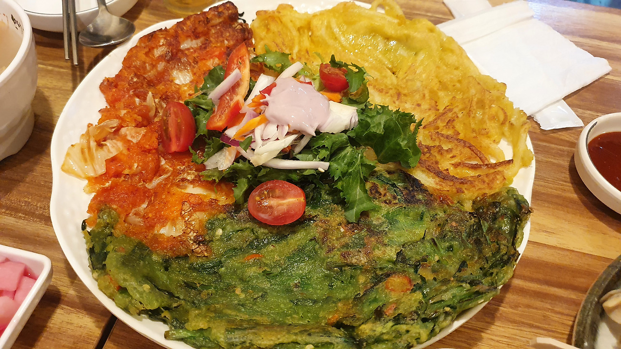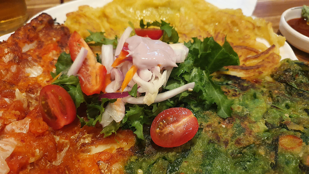 접시 중앙에는 신선한 채소와 방울토마토가 얹혀 있었고, 그 위에 샐러드 드레싱이 살짝 뿌려져 있어 전의 느끼함을 잡아주는 상큼한 조화를 선사했습니다. 전을 많이 먹다 보면 느끼할 수 있는데, 이렇게 식감과 향을 정리해주는 구성은 정말 센스 있는 디테일입니다.