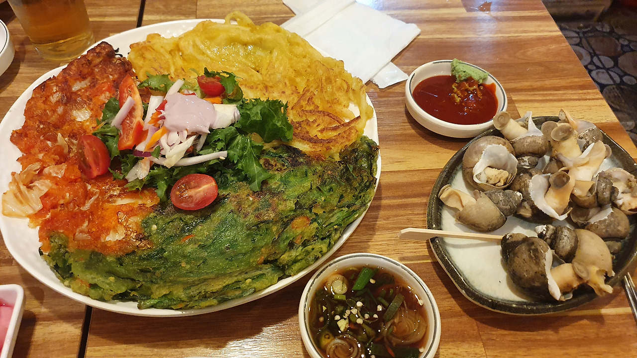 전의 굽기는 전반적으로 노릇노릇 바삭한 편이지만, 속은 촉촉하게 살아 있어 재료 본연의 맛을 즐길 수 있었고, 간장 소스에 찍어 먹을수록 감칠맛이 더해졌습니다.