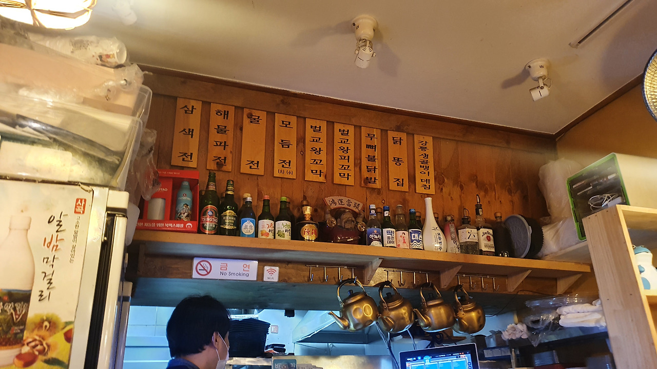 외관은 수수하지만 내부로 들어서면 목재로 된 인테리어와 다양한 전통 술병들이 눈에 들어옵니다. 특히 벽에 걸린 손글씨 메뉴판이 시선을 사로잡으며, 황동 주전자와 오래된 조명이 어우러져 주막 같은 정감을 더합니다.