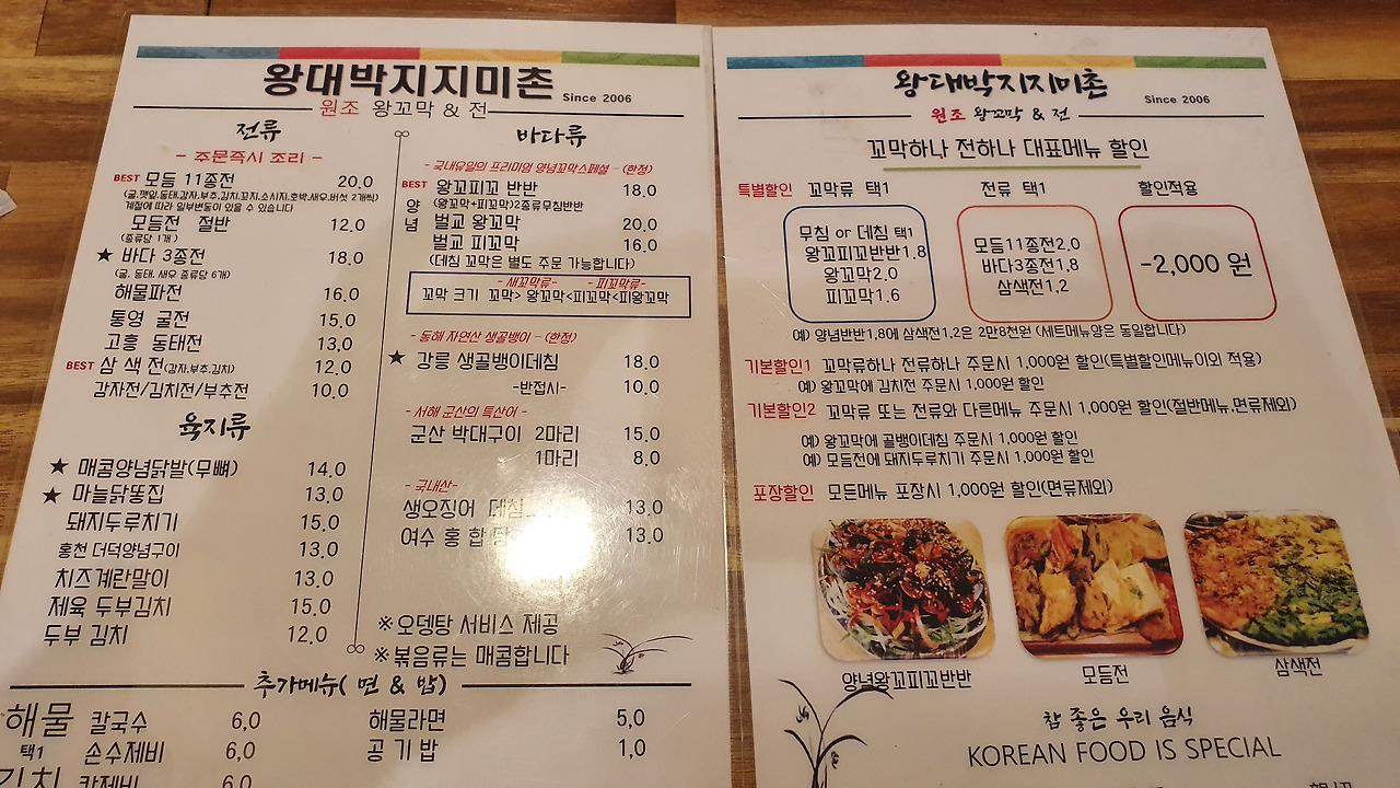 한 상 가득 채워진 전과 바다의 안주, 그리고 부담 없이 마실 수 있는 막걸리 한 사발. 왕대박지지미촌은 특별할 것 없는 음식들을 가장 한국적인 방식으로, 가장 전통적인 맛으로 풀어냅니다.