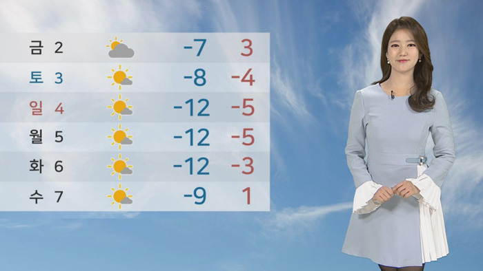 • 서울: 아침 -7도, 낮 -3도 내외, 맑음