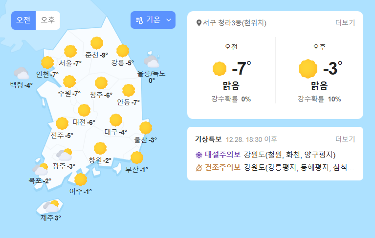 - 서울: 아침 -7도, 낮 -3도 내외, 맑음